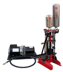 With this hydraulic model the operator inserts the empty shells and wads, and the reloader does the rest. With each complete downstroke of the foot pedal, all reloading operations are performed at all six stations.
